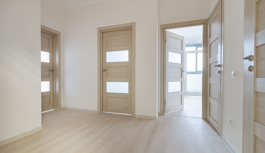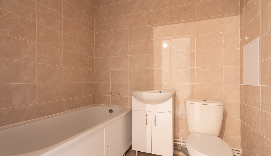 Вся отделка выполнена в светлых, теплых тонах, что добавляет квартире еще больше света и уюта. Межкомнатные двери установлены со стеклом — это предает больше легкости и зрительно увеличивает помещение, влагостойкий ламинат по всей квартире не ограничивает зоны на мокрые и сухие, а наоборот придает пространству единение и так же визуально увеличивает его. Стены ванной комнаты облицованы светлым кафелем, на полу в тон — керамогранит, установлена душевая кабина (в зависимости от площади квартиры может быть установлена ванна), интегрирована раковина с тумбой, унитаз, установка стиральной машины. Ламинат, как и дерево, всегда теплый, и для тех, кто любит ходить босиком, будет также комфортно.